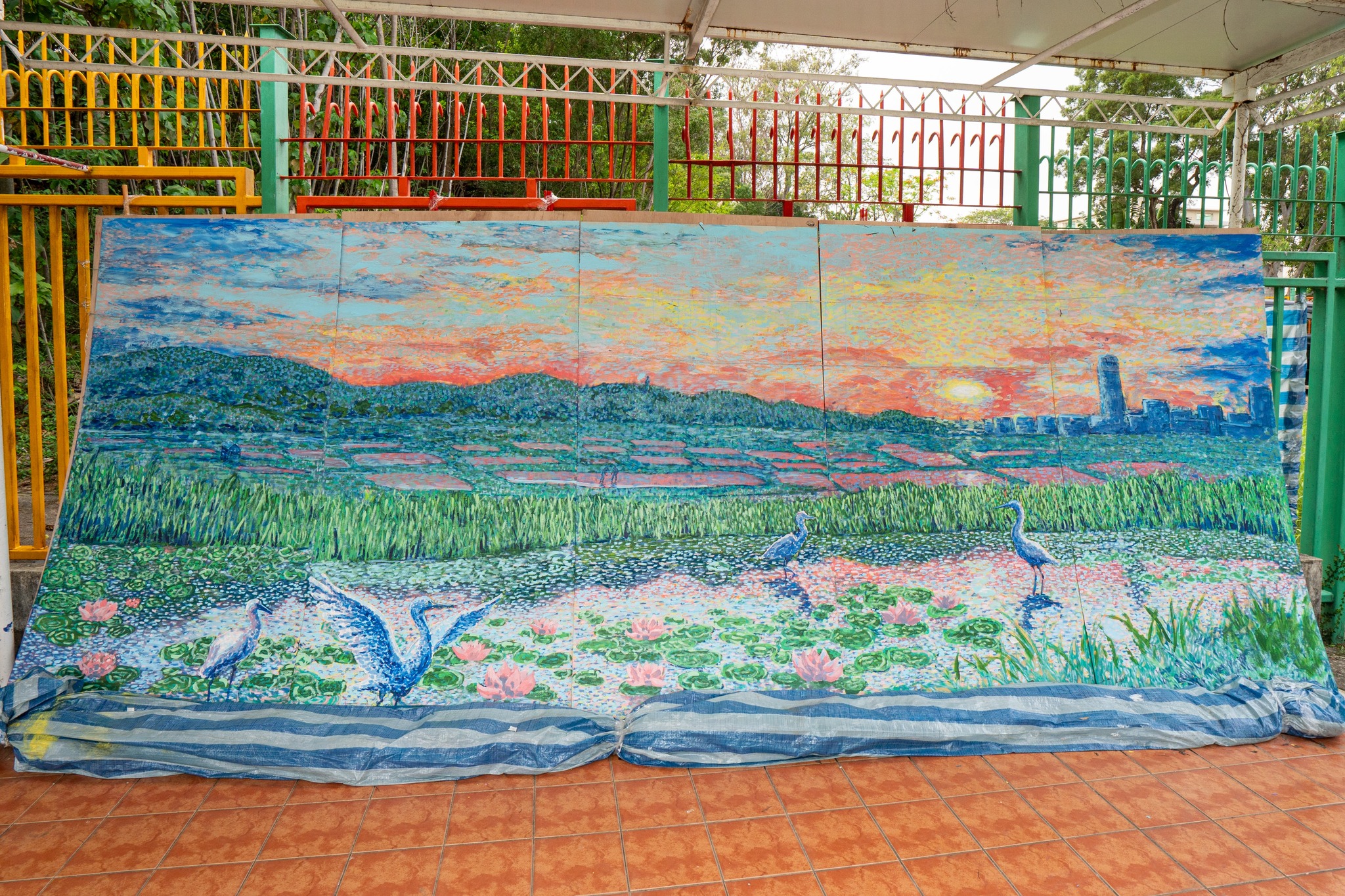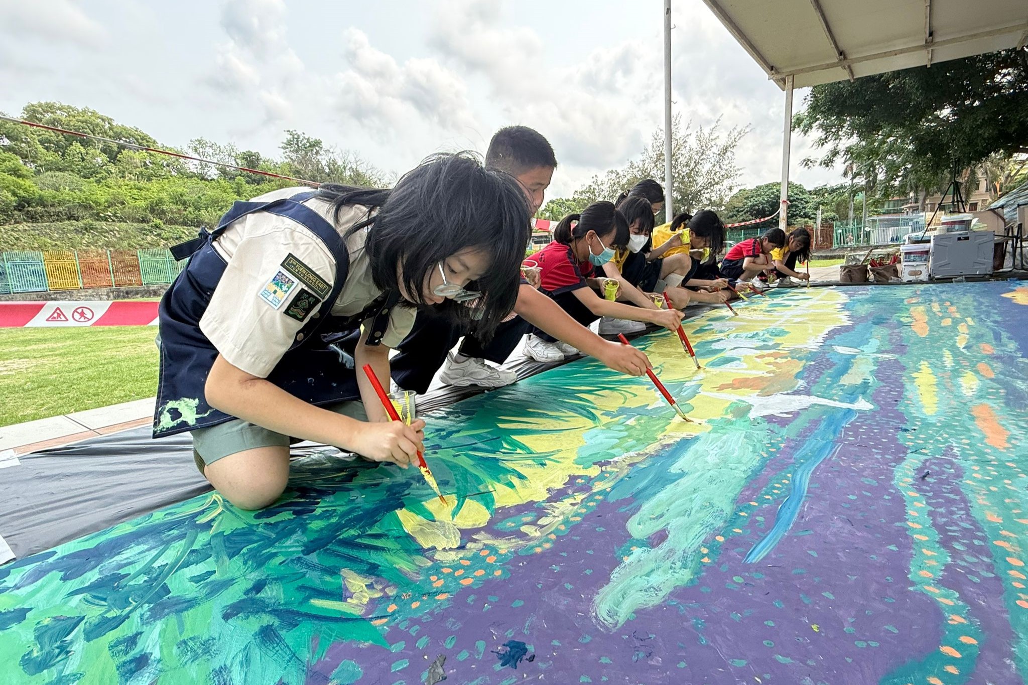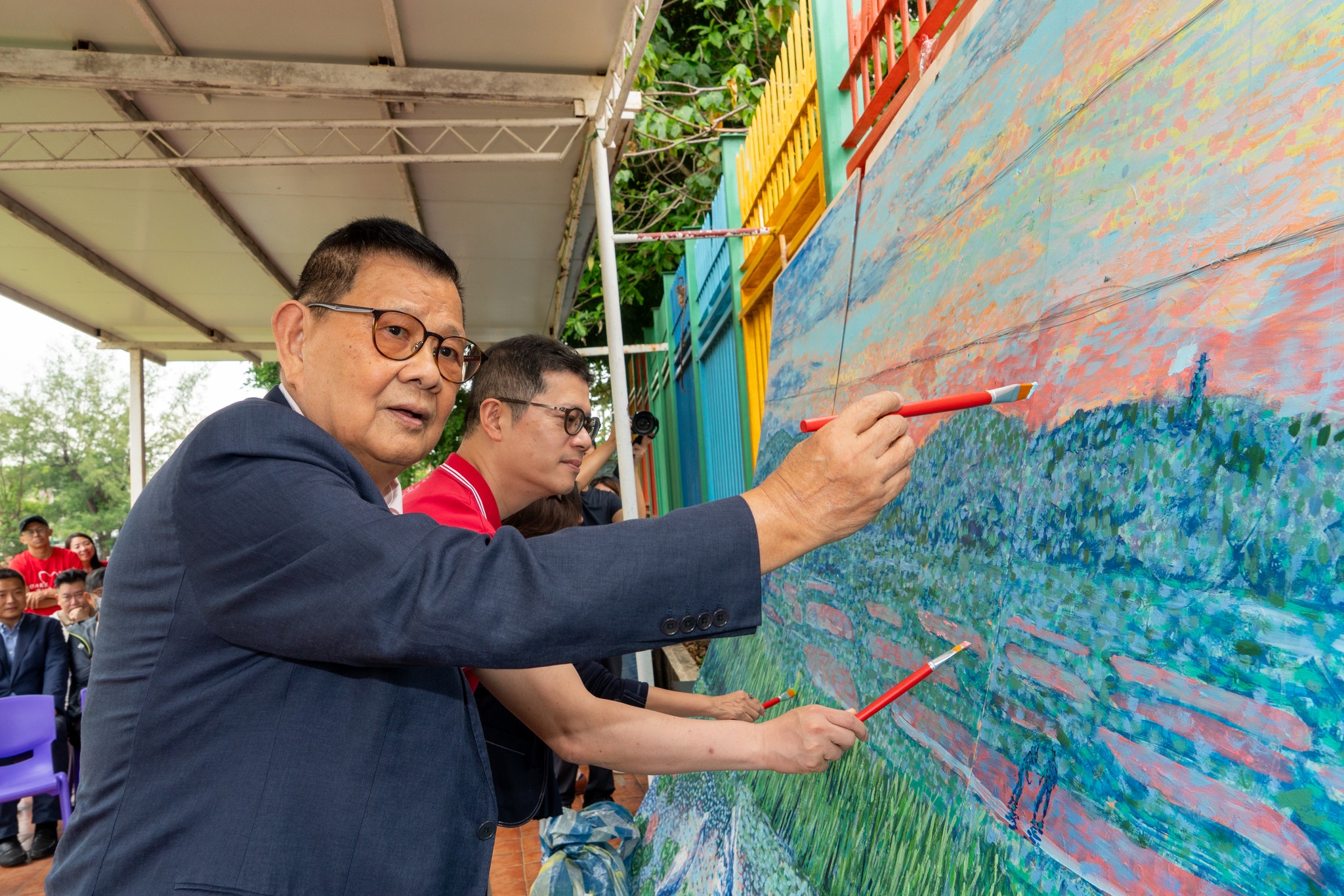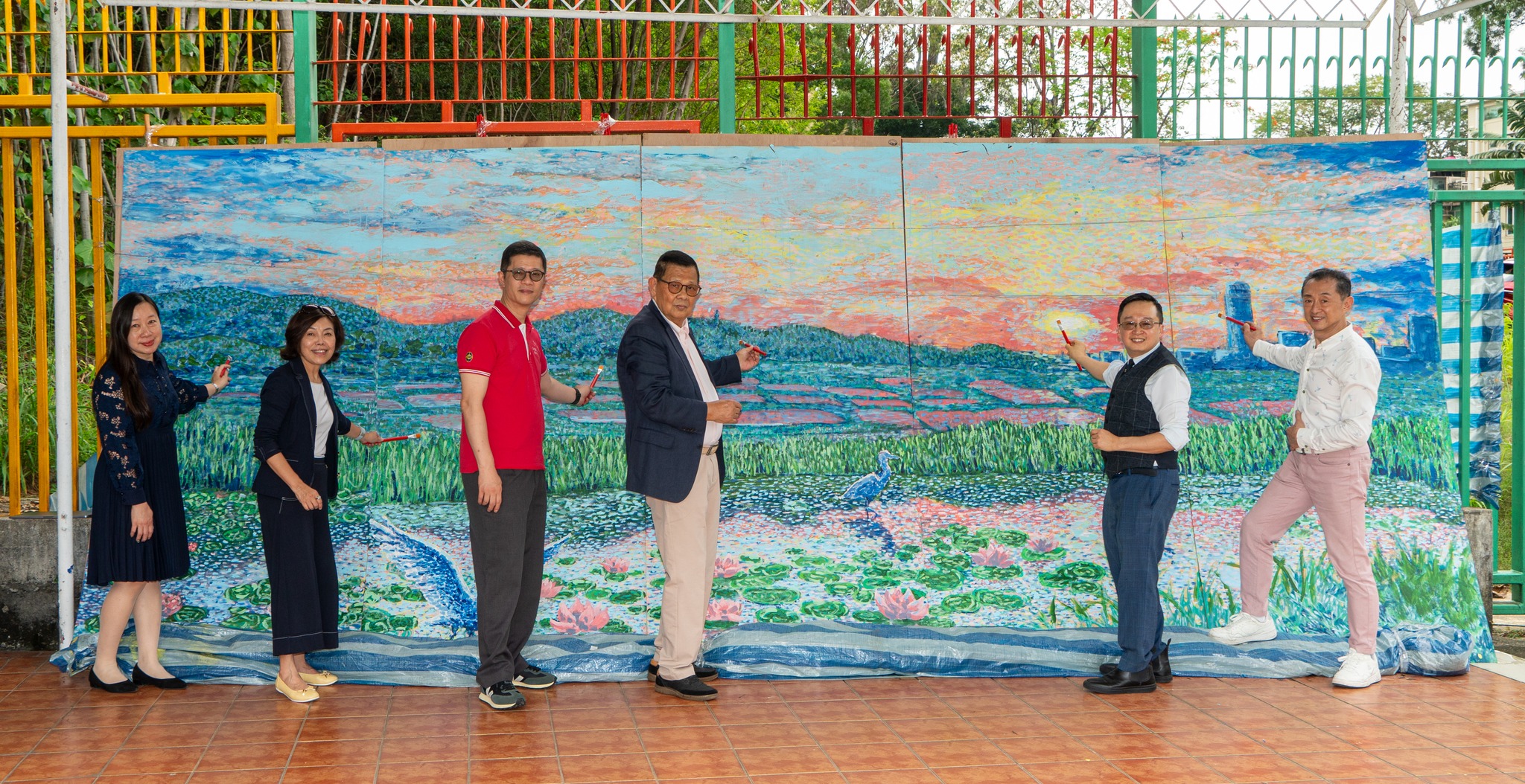 本局聯同香港賽馬會合辦的「鄉情畫意」鄉郊彩繪計劃 — 新田鄉壁畫收筆禮已於4月25日下午在惇裕學校順利舉行。荷蒙新田鄉鄉事委員會文祿星主席、香港賽馬會會對外事務部主管鄭琪先生、惇裕學校陳杏軒校長、元朗民政事務處高級聯絡主任徐寶玲女士、鄉議局新界傳統文化委員會陳嘉敏主任委員以及畫家林旭輝先生蒞臨擔任主禮嘉賓,為壁畫添上最後一筆,象徵新田鄉壁畫正式完成;亦感謝鄉議局當然執行委員黃戊娣女士、香港賽馬會對外事務部總經理孫婉芳女士、文亦揚區議員、文劍峰教授及新田鄉多位村代表親臨觀禮。